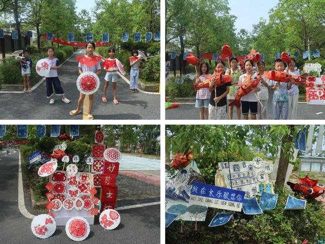 随着一声鼓响,文艺汇演正式开始。整场演出以“古韵”“童心”“未来”三大篇章串联,所有节目均由夏令营营员与志愿者老师同台完成。开场舞狮《醒·长乐》,鼓声三下,红、黄两头醒狮跃上高台,高年级同学逐个一前一后,配合默契,狮子时而舔毛搔痒,时而腾空采青。江西鲤鱼灯《鱼跃此时》,表演方阵的同学们各持一盏鲤鱼灯,鱼儿仿佛在空气中游弋,寓意“年年有余”。同学们围绕“鲤鱼”奔跑,欢呼声此起彼伏。非遗走秀《面·扇·纸》,君君老师头戴巨型傩面具,身披黑红斗篷,气势非凡;秀秀老师手执漆扇,一步一摇,扇面兰花随步生风;星星老师高擎剪纸龙灯,龙身由孩子们剪出的“福”字相连,十分生动。